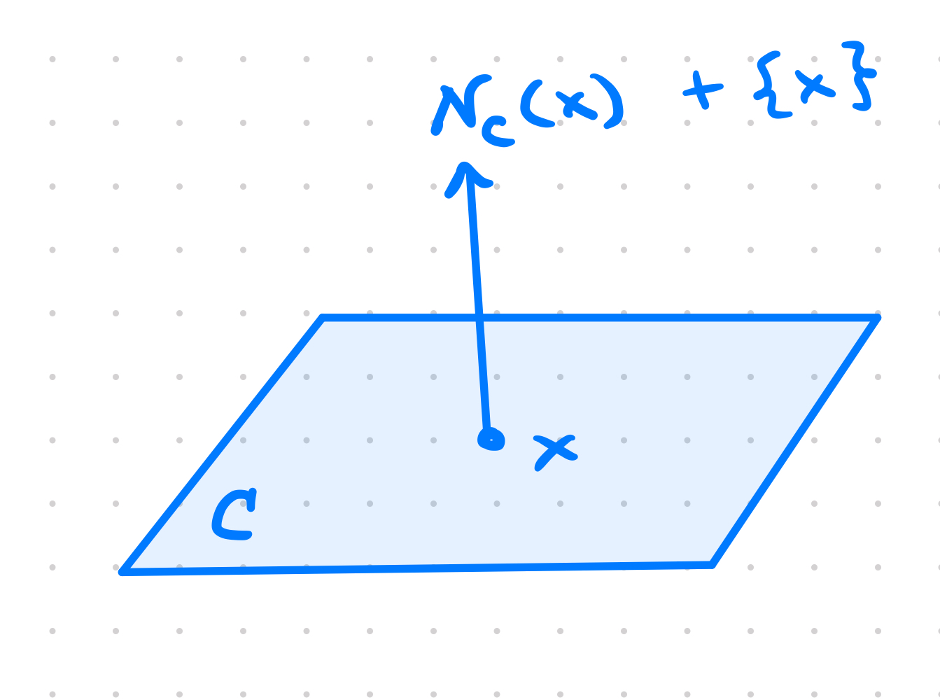 together, these imply \(g=0\), and thus \[ x\in\mathop{\rm int} C \implies \mathcal{N}_C(x) = \set{0} \] [aside; the opposite implication is also true, but requires the supporting hyperplane theorem.]