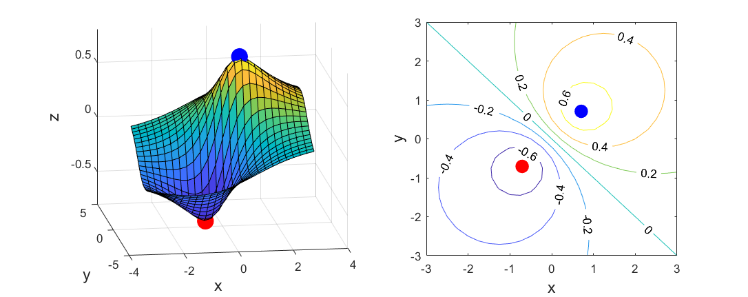 \[ \min_{x\in\R^2}\, \frac{x_1+x_2}{x_1^2+x_2^2+1} \]