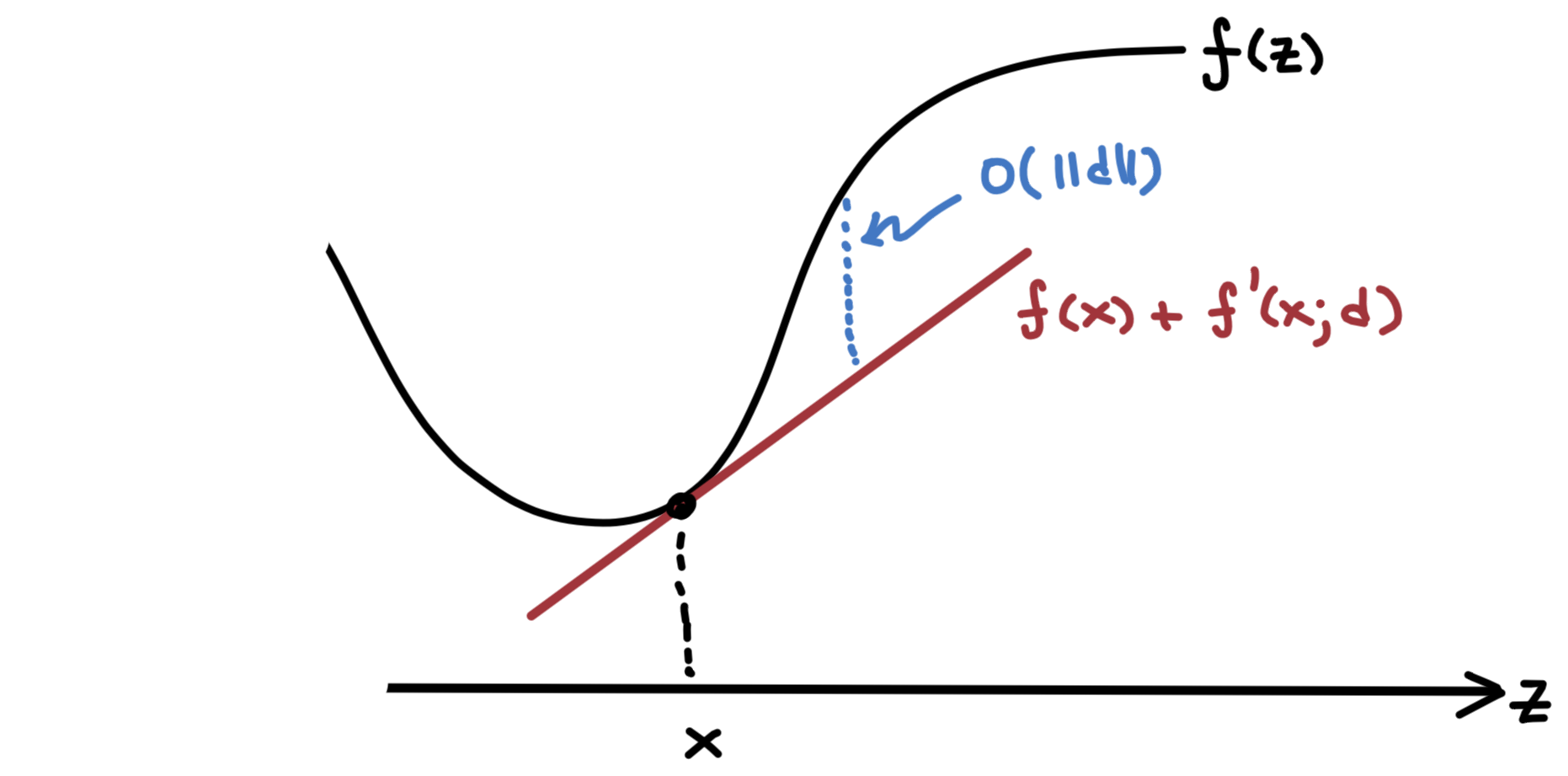 \[ \begin{aligned} f(x+d) = f(x) + \nabla f(x)\T d + \omicron(\norm{d}) = f(x) + f'(x;d) + \omicron(\norm{d}) \end{aligned} \]