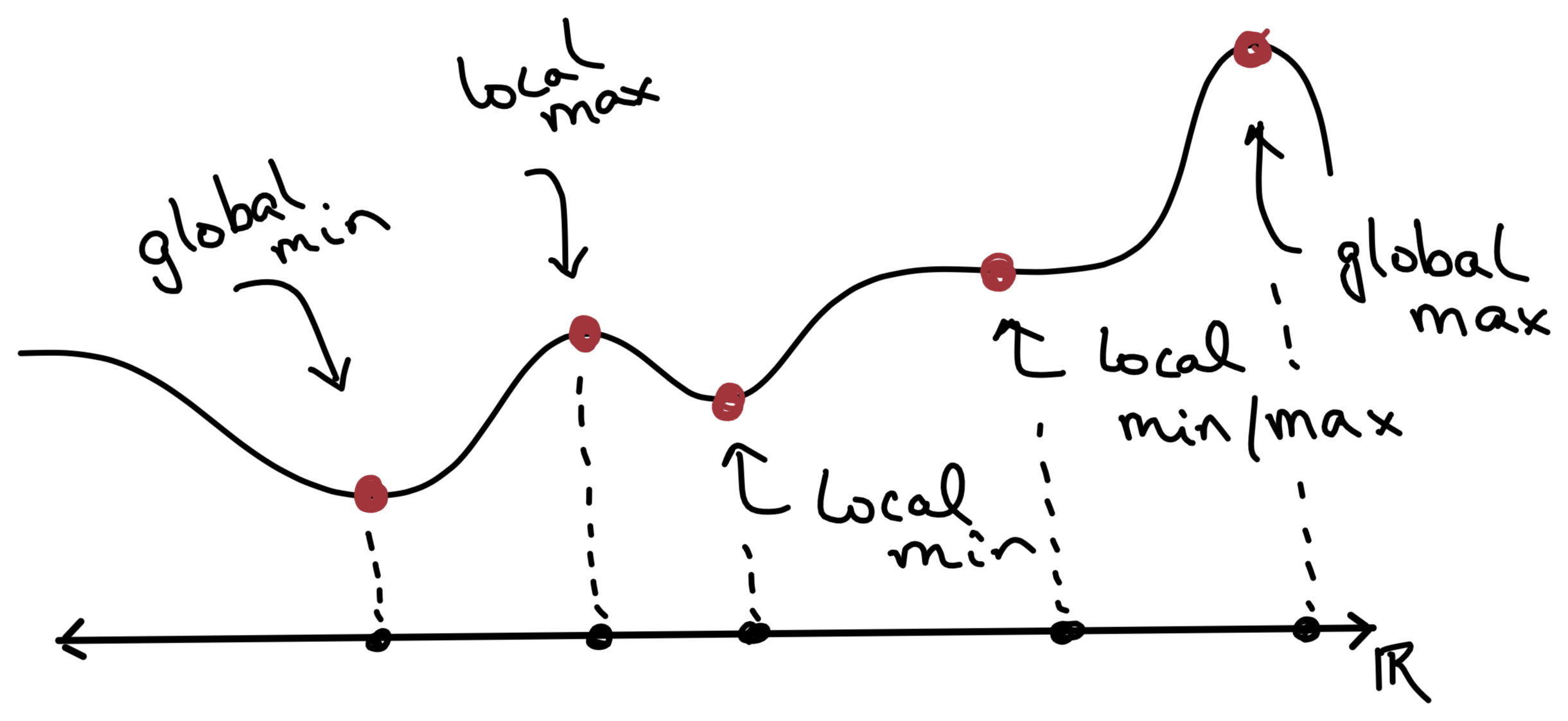 local maximizer if \[ \underbrace{f'(x) = 0}_{\text{stationary at $x$}} \textt{and} \underbrace{f''(x) < 0}_{\text{(strictly) concave at $x$}} \]