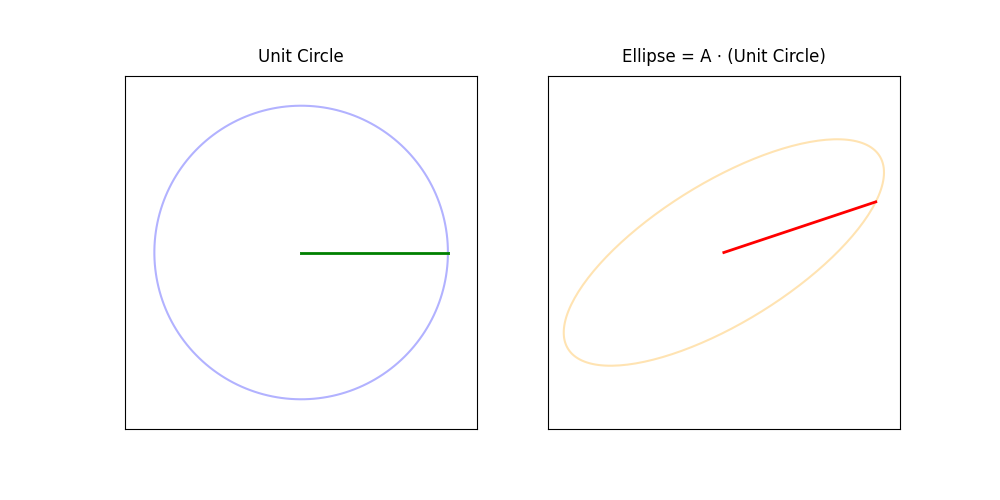 For any \(m\times n\) matrix \(A\) with rank \(r\) \[ \begin{aligned} A = U\Sigma V^T = [u_1\ |\ u_2\ |\cdots\ |\ u_r] \begin{bmatrix} \sigma_1 & & & \\ & \sigma_2 & & \\ & & \ddots & \\ & & & \sigma_r \\ \end{bmatrix} \begin{bmatrix} v_1^T \\ \hline v_2^T \\ \hline \vdots \\ \hline v_r^T \end{bmatrix} = \sum_{j=1}^r \sigma_j u_j v_j^T \end{aligned} \] left \(U\) and right \(V\) singular vectors are orthonormal and singular values: \[ U^T U = I_r, \qquad V^T V = I_r, \qquad \sigma_1 \geq \sigma_2 \geq \cdots \geq \sigma_r > 0 \]
